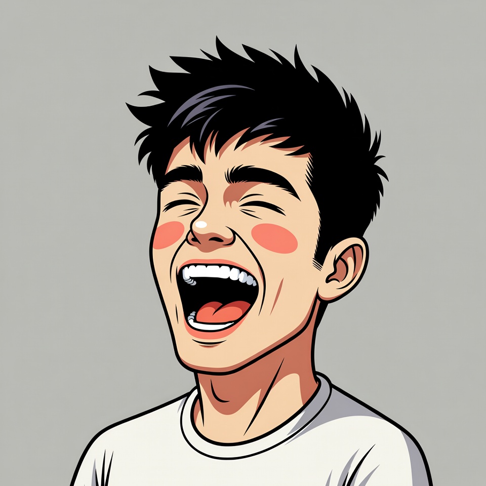 A cartoon illustration of a young Asian boy with spiky black hair laughing heartily. He has wide-open mouth, squinted eyes, and pink blush on his cheeks. He wears a simple white shirt collar against a plain gray background.