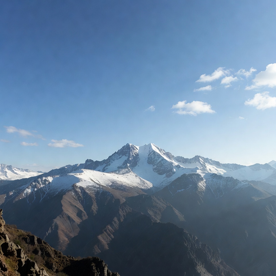 A majestic snow-capped mountain peak rises sharply against a clear blue sky with scattered white clouds. Surrounding rugged mountains feature brown rocky slopes and patches of snow. The foreground shows rocky terrain with green vegetation under golden sunlight.