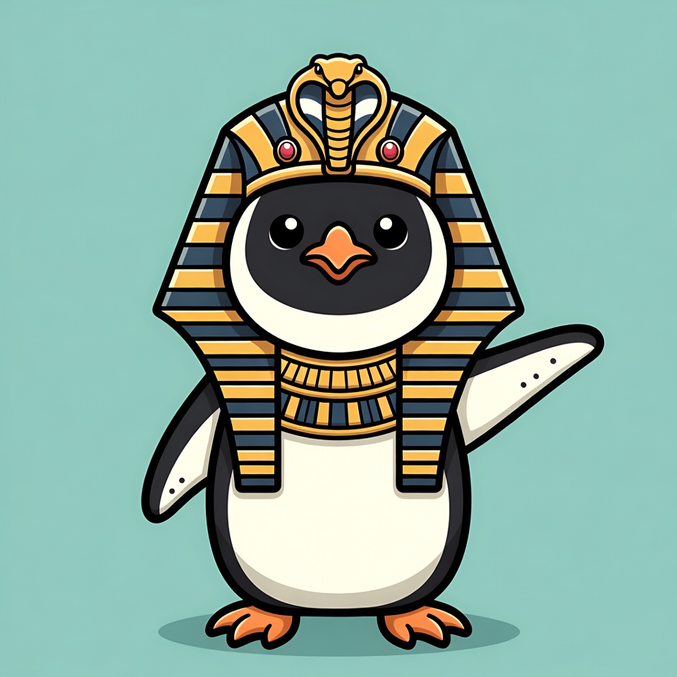 A cute cartoon penguin wears a golden Egyptian pharaoh headdress with a cobra and red gems. It stands on a light blue background with one flipper raised in a waving pose. The illustration features black and white penguin feathers, orange feet, and striped yellow and gold cloth.