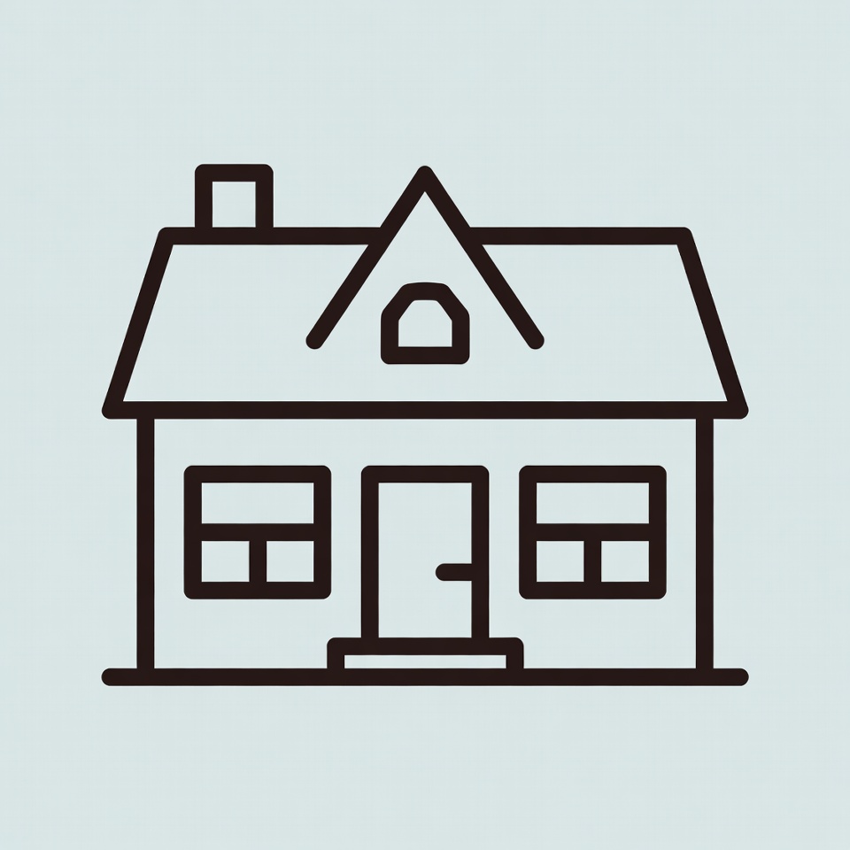 A simple black line illustration of a house on a light gray background. The house features a gabled roof with a chimney, a central front door flanked by two windows, and a small stoop. It has clean, minimalist line art style.