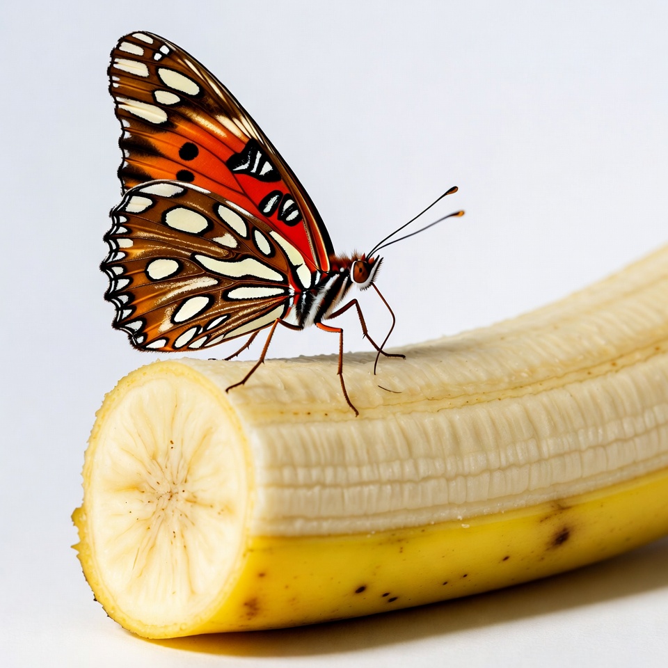 banana, detailed wings, fruit, insect, isolated, macro photography, nature, orange butterfly, peeled banana, spotted wings, vibrant colors, white background, wildlife, yellow banana, butterfly
