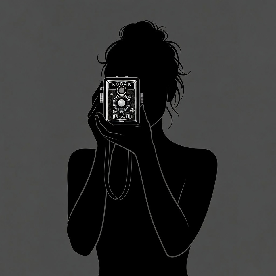 A black silhouette of a woman with messy bun hairstyle holds a vintage Kodak Brownie camera in front of her face. She stands against a gray background, with her hands gripping the camera's sides. The image features clean line art outlining her profile and the classic box camera design.