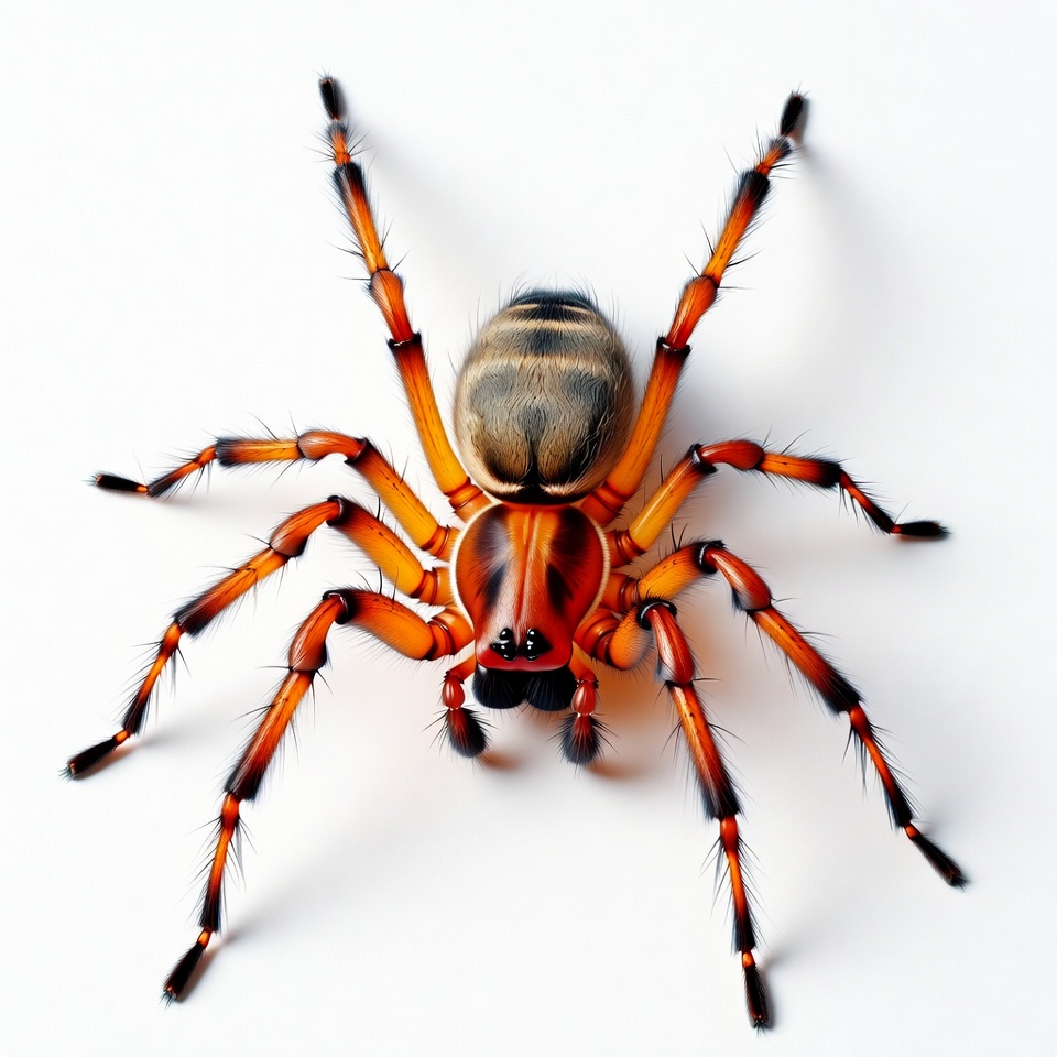arachnid, black stripes, detailed spider, eight legs, furry spider, insect-like, isolated, long legs, macro view, orange spider, red spider, striped abdomen, white background, wildlife, spider