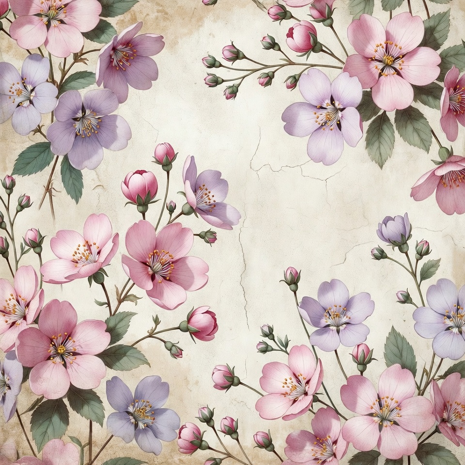 aged paper, artistic background, beige background, blossom branches, botanical art, cracks, decorative flowers, digital illustration, floral design, floral illustration, floral pattern, flower art, flower buds, flower cluster, green leaves, lavender flowers, nature illustration, petals, pink flowers, purple flowers, sakura flowers, soft pink, spring flowers, stems, textured paper, vintage background, wallpaper pattern, watercolor flowers, cherry blossoms