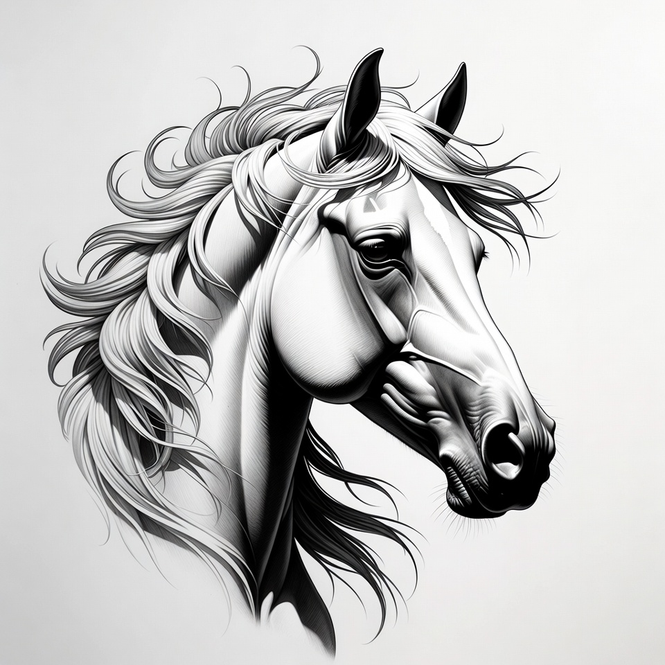 animal, black and white, detailed, drawing, equine, flowing mane, horse head, horse illustration, illustration, isolated background, majestic horse, portrait, realistic, stallion head, white horse, horse