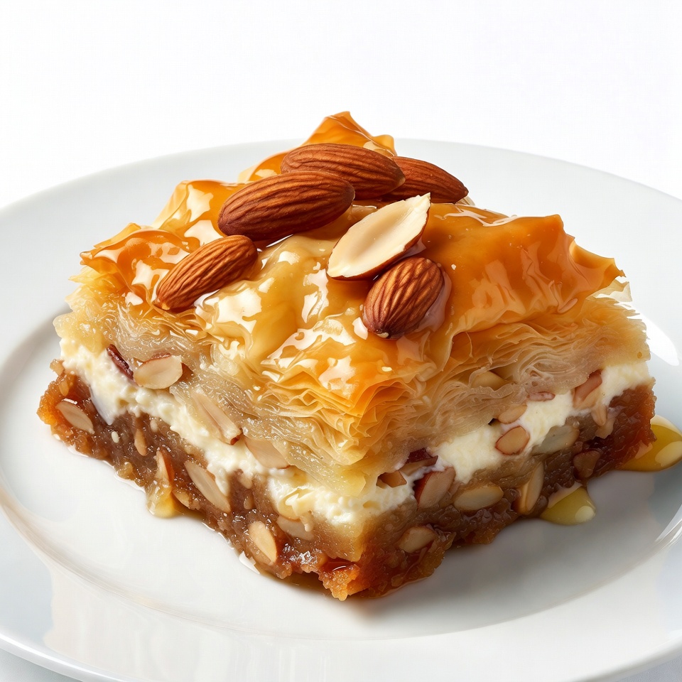 Greek pastry, Middle Eastern sweet, Turkish dessert, almonds, cheese filling, dessert, flaky layers, food photography, golden syrup, gourmet dessert, honey drizzle, isolated background, layered pastry, nut topping, nuts, pastry, phyllo dough, sweet treat, syrup, white plate, baklava