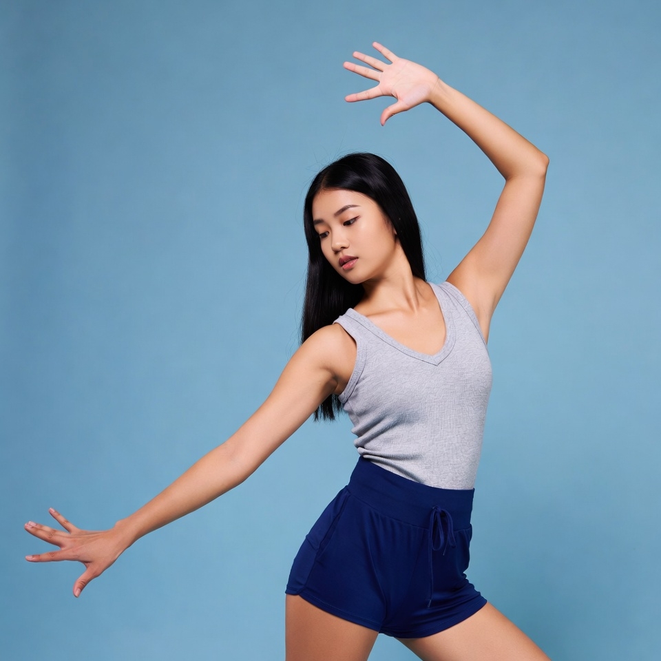 Asian, arms raised, athletic pose, ballet, blue background, dance pose, dancer, dancing, dynamic pose, female, graceful, gray tank top, hands extended, isolated background, long black hair, modern dance, navy shorts, slim build, straight hair, studio photo, young woman, woman