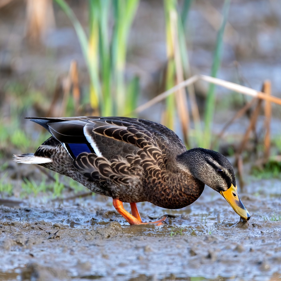 beak, bird, duck foraging, feathers, grass, green head, male duck, muddy water, nature, orange legs, reeds, waterfowl, wetlands, wild duck, wildlife, wings, yellow bill, mallard duck