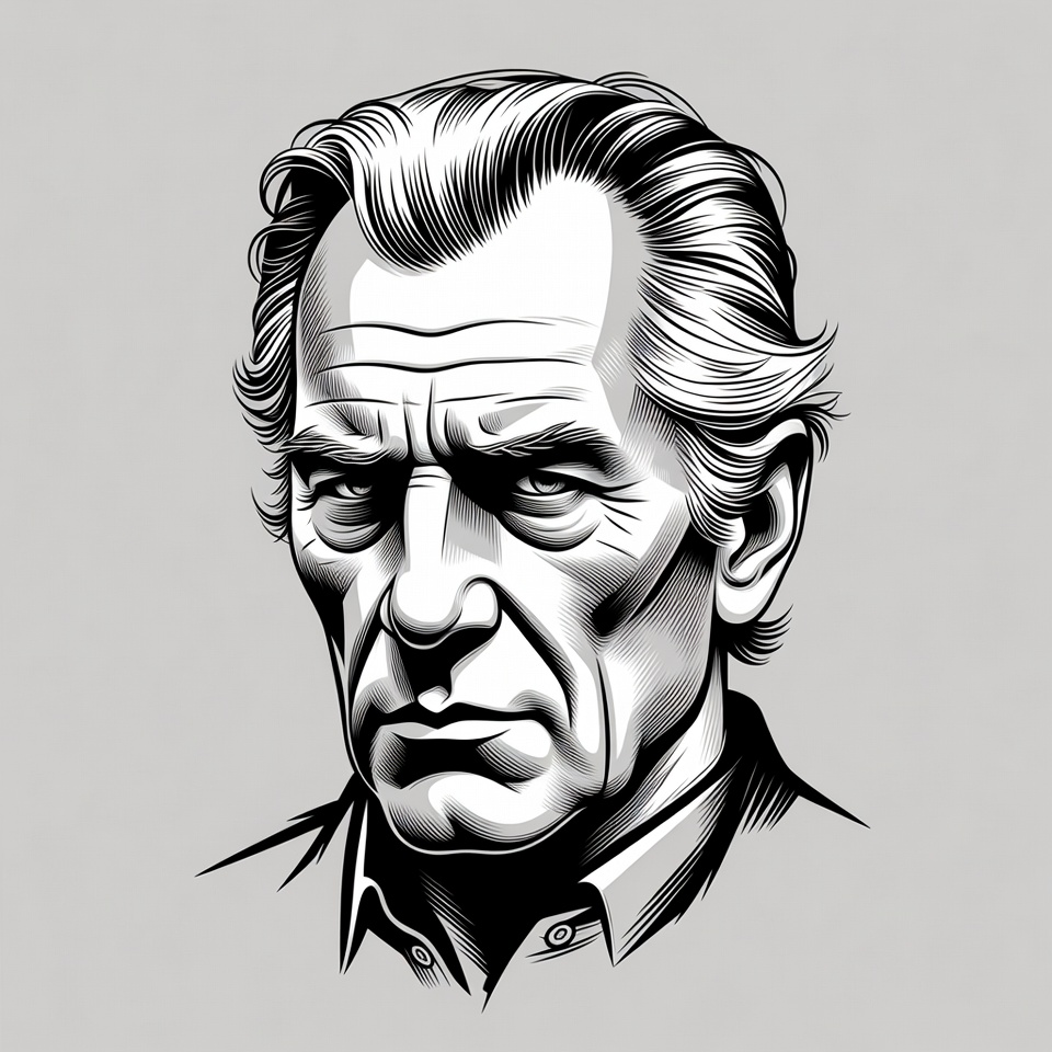 A black and white line art illustration depicts an elderly man with swept-back white hair and a stern expression. He wears a collared shirt and gazes directly forward with furrowed brows. The portrait is set against a plain gray background.