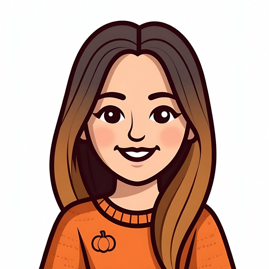 A cartoon illustration of a young woman with long brown ombre hair smiles happily. She wears an orange knit sweater adorned with a small pumpkin pin. The image features a clean white background.