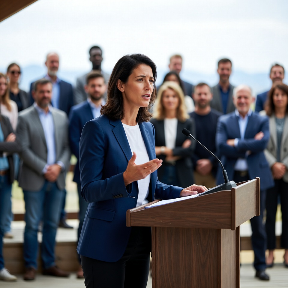 A brunette woman in a blue blazer stands at a wooden podium, speaking into a microphone with her hand raised. A diverse crowd of men and women in business attire stands behind her on an outdoor wooden deck under a cloudy sky. The audience includes White, African-American, and other ethnicities, attentively listening.