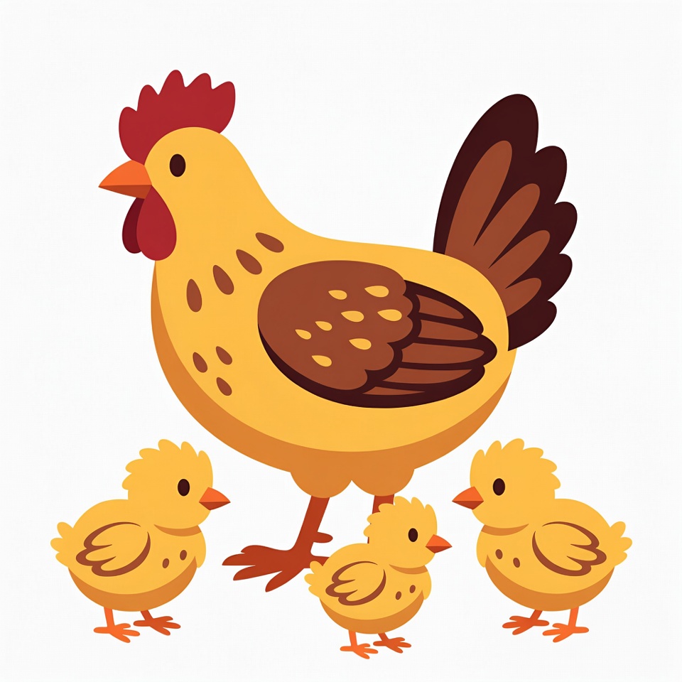 A yellow hen with a red comb and brown wings stands protectively over four small yellow chicks. The chicks huddle together at her feet on a white background. This colorful cartoon illustration features detailed feathers and expressive faces.