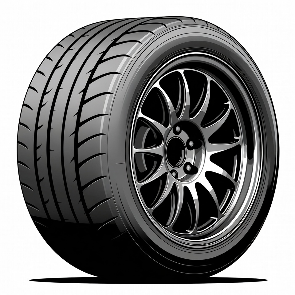 A detailed illustration of a black high-performance car tire mounted on a shiny silver alloy wheel. The tire features prominent tread patterns and sidewall markings, viewed from a three-quarter angle. It is isolated on a white background.
