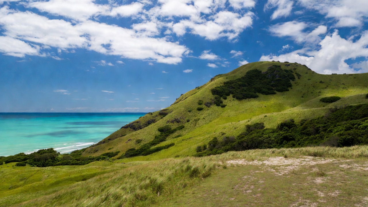 beach, blue sky, bushes, cliff, clouds, coastline, grass, hilltop, landscape, lush greenery, nature, ocean, outdoors, scenery, seaside, shore, sky, tropical, turquoise sea, waves, green hill
