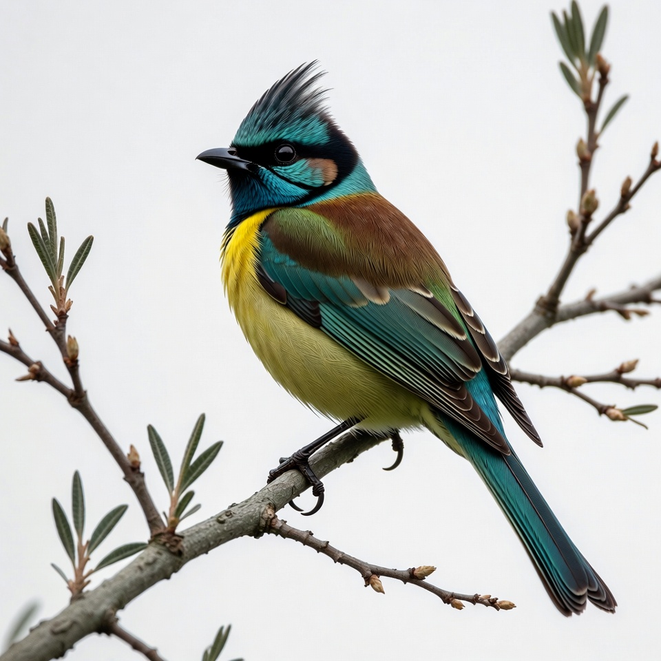 A vibrant crested bee-eater bird with a striking blue crest, turquoise body, yellow throat, and brown wings perches on thin branches. Its black eye mask and sharp beak stand out against the white background. Delicate green leaves frame the bird's detailed feathers.