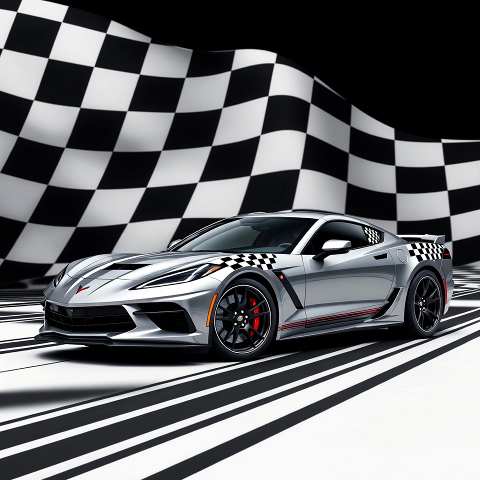 Silver Chevrolet Corvette with Checkered Background