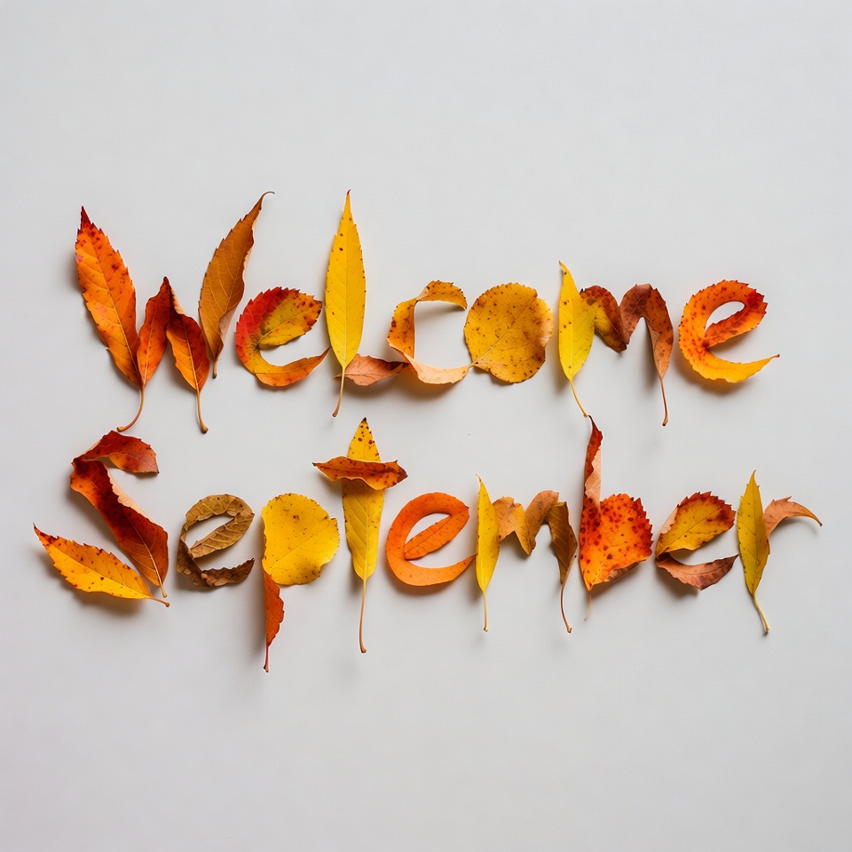 The words 'Welcome September' are formed from colorful autumn leaves in shades of yellow, orange, and red. The letters are arranged on a plain white background. Individual fallen leaves accentuate the text design.