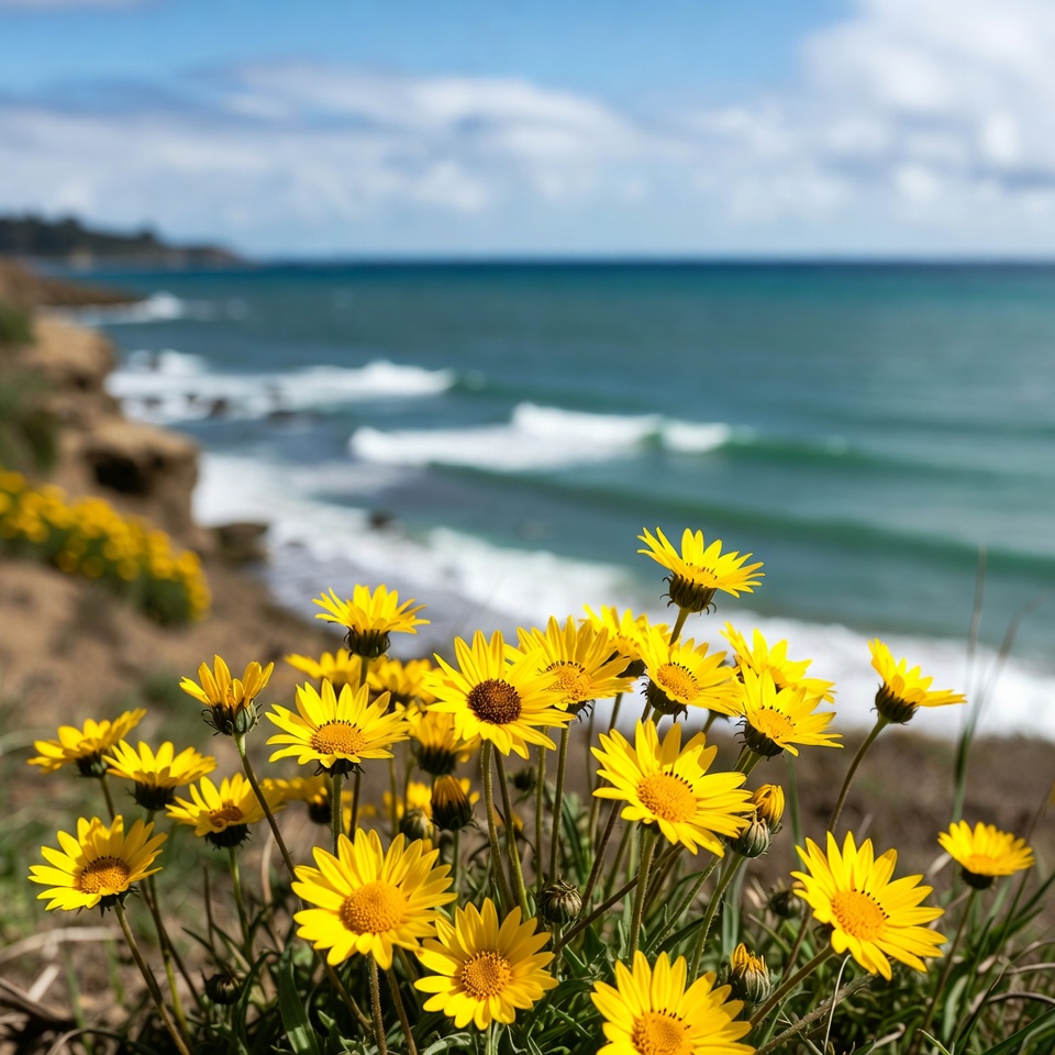 Yellow Daisies on Coastal Cliff