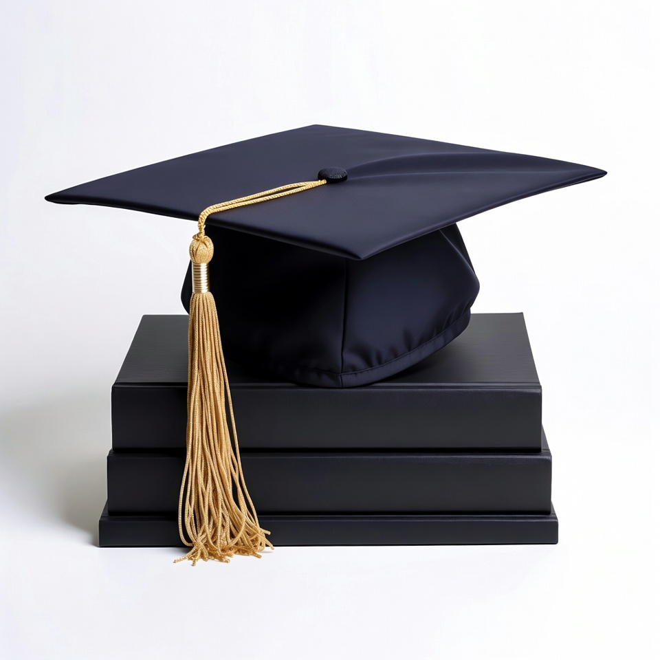 A black graduation cap with a gold tassel sits atop a stack of three black books. The cap features a square shape with a curved top and the tassel draped over the side. The items are centered against a plain white background.