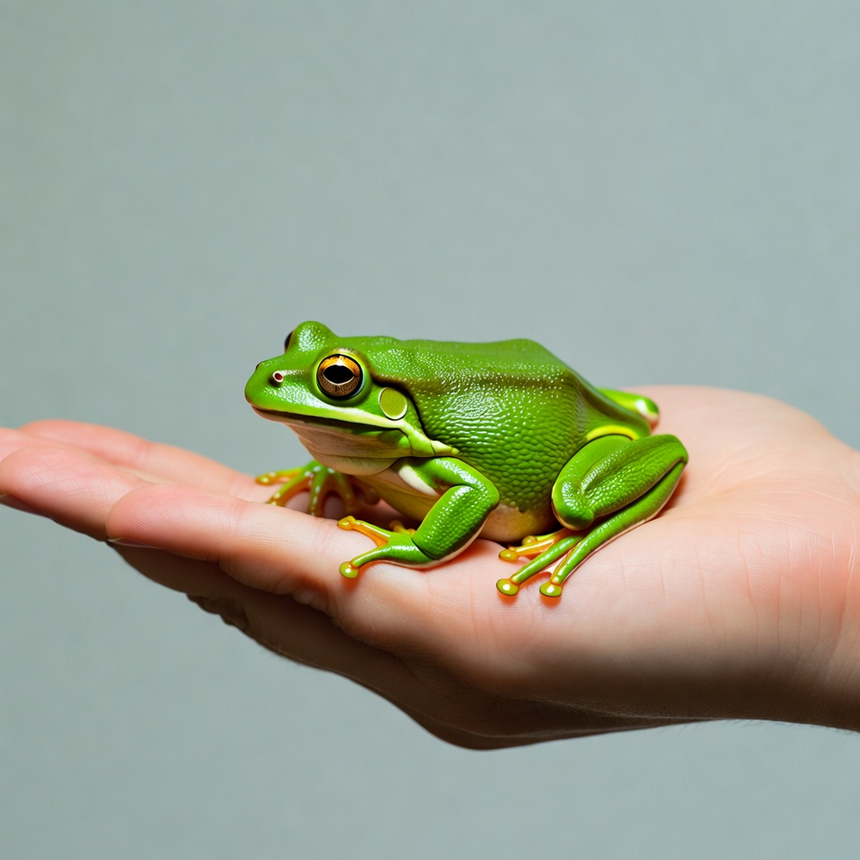 A vibrant green tree frog with yellow markings sits calmly in an open human hand. The frog has large golden eyes and smooth skin, perched on the palm against a plain gray background. The hand holds the frog gently, showcasing its small size and detailed features.
