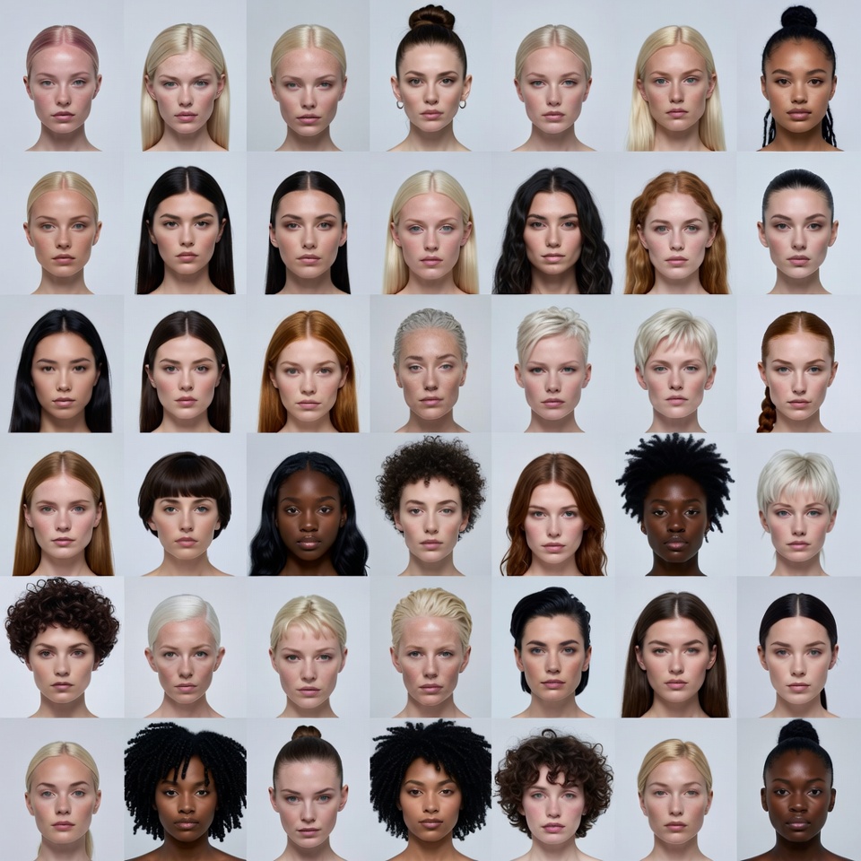 A grid of close-up headshots features numerous women with diverse ethnicities, hairstyles, and hair colors. The portraits include straight, curly, and braided hair in shades from blonde to black, arranged in neat rows on a plain background. All women face forward with neutral expressions.