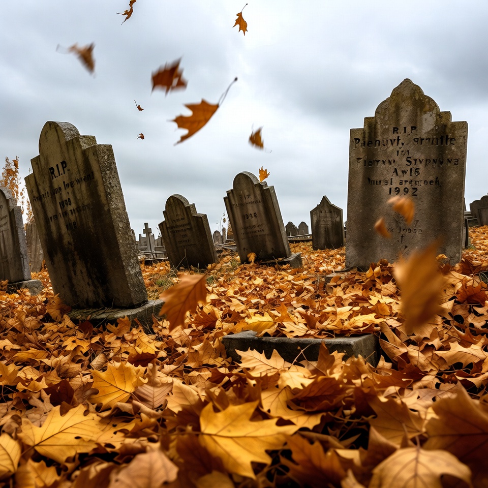Numerous weathered gravestones stand in a cemetery covered with a thick layer of orange and yellow autumn leaves. Falling leaves swirl through the gray sky above the tombstones. The scene features Cyrillic inscriptions on some stones and a foggy, overcast atmosphere.