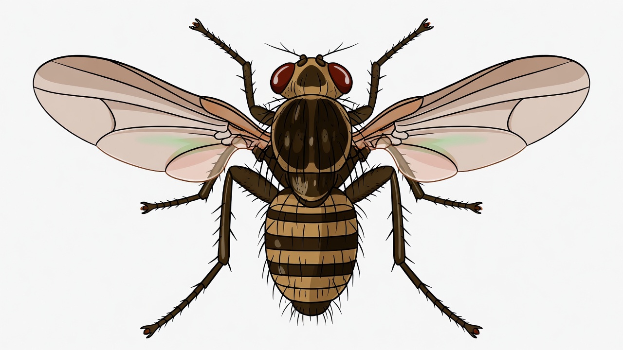 A detailed illustration of a housefly with striped brown abdomen, large red compound eyes, and translucent wings spread open. The fly stands on spindly black legs against an isolated white background. Its body features fine hairs and realistic insect anatomy.