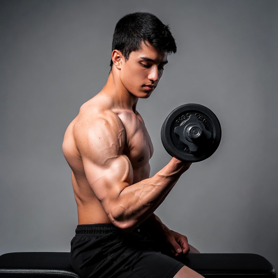 A muscular young Asian man with short black hair performs a dumbbell bicep curl while seated on a bench. He is shirtless, wearing black shorts, and has defined abs and bulging arm muscles. The background is plain gray.