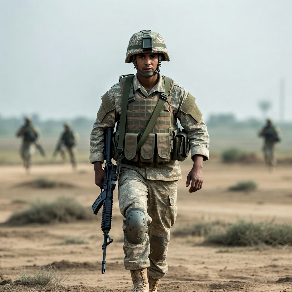 Asian, armed forces, army, assault rifle, battlefield, camouflage, combat gear, desert, dusty terrain, gear, helmet, infantry, male, man, military, patrol, rifle, sand, soldiers in background, tactical vest, troops, uniform, walking, weapon, soldier