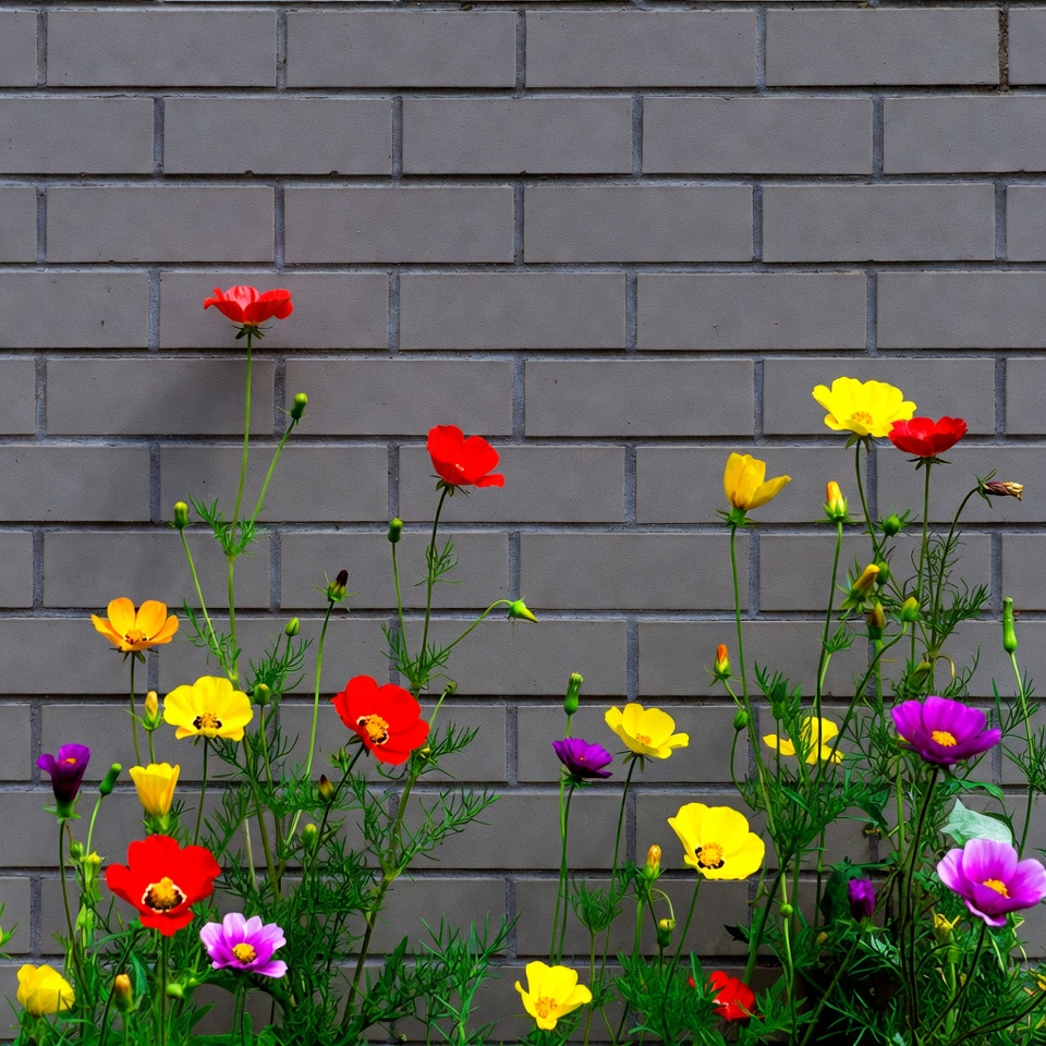 blooming flowers, brick wall, colorful flowers, flower cluster, foliage, garden flowers, gray wall, green stems, outdoor flowers, pink flowers, poppies, purple flowers, red flowers, vibrant bouquet, wall flowers, yellow flowers, flowers