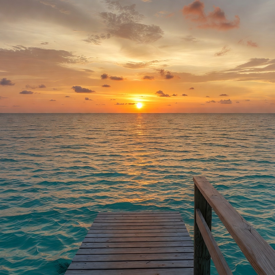 beach, calm water, clouds, dock, horizon, nature, ocean, orange sky, paradise, pier, sea, seascape, sky, tropical, turquoise water, vacation, waterfront, waves, wooden pier, sunset