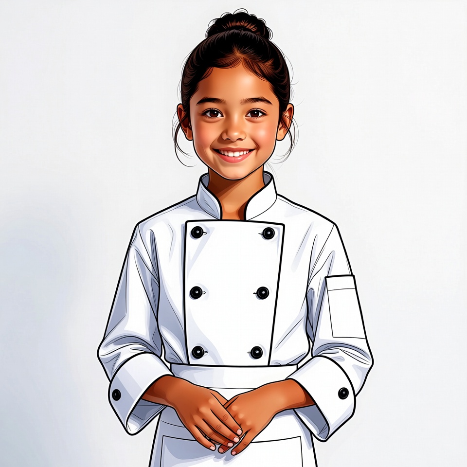 A young Asian girl with dark hair in a bun smiles happily while wearing a white chef uniform. She stands with her hands clasped in front, against a plain white background. The illustration features a detailed chef jacket with double-breasted buttons and a pocket.