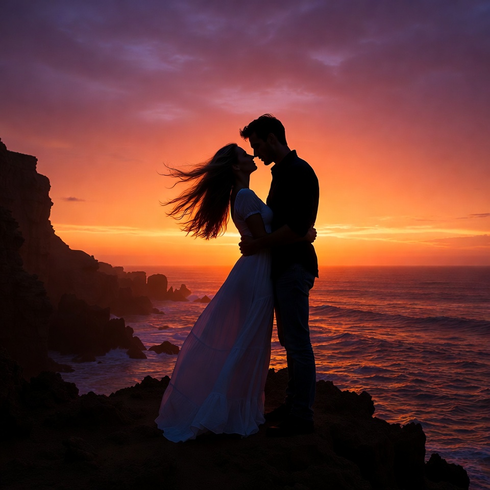 A silhouette of a man and woman stands on a rocky ocean cliff during a vibrant sunset. The woman wears a flowing white dress with wind-swept hair, embraced by the man in dark shirt and jeans. Orange and purple skies reflect over the crashing waves below.