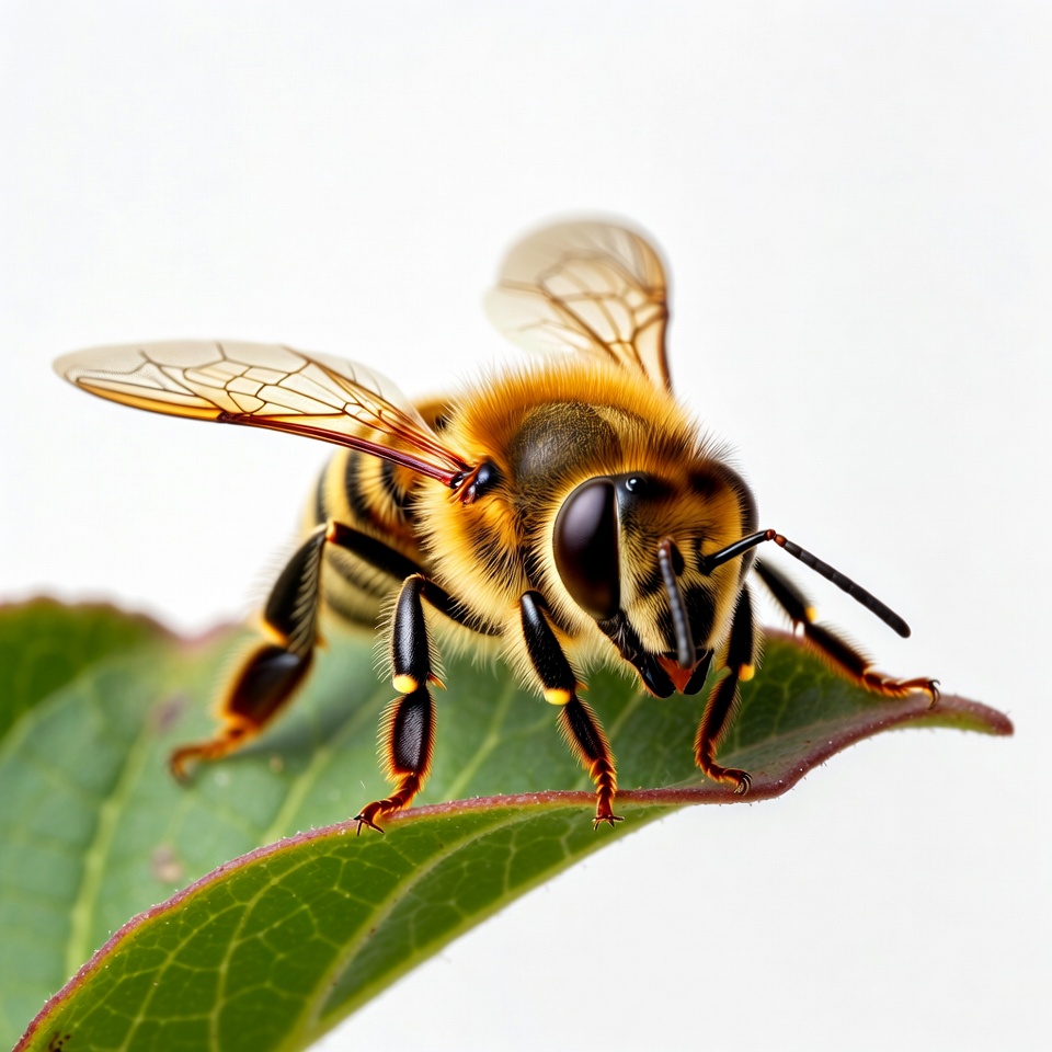 A close-up of a honey bee perched on a green leaf with its wings partially spread. The bee's striped yellow and black body, fuzzy thorax, and large compound eyes are prominently visible. It grips the leaf edge with its legs against a white background.