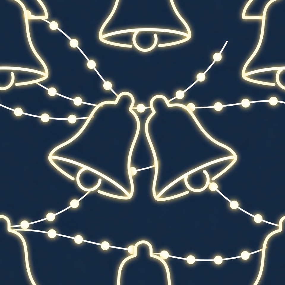 Christmas bells, bell garland, clipart, dark background, festive decoration, glowing bells, holiday pattern, illustration, jingle bells, navy blue, neon outline, repeating pattern, seamless pattern, string lights, vector art, wedding bells, yellow bells, bells