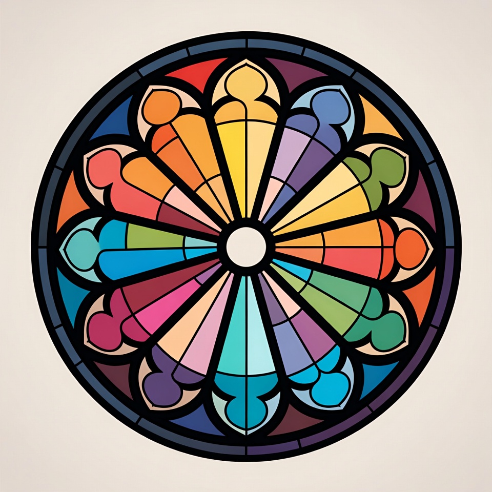 A vibrant circular stained glass window features a symmetrical rose design with intricate Gothic arches. It displays a spectrum of colors including reds, blues, yellows, greens, and purples in each segmented petal-like section. The artwork is isolated on a plain background.