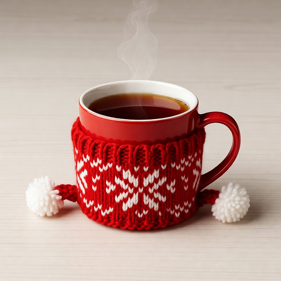 Christmas, beverage, cozy mug, festive mug, holiday, hot tea, isolated background, knitted cozy, pom poms, red mug, snowflake pattern, steam, tea, white table, wooden table, mug