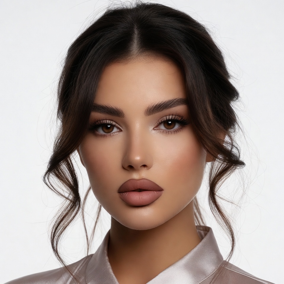 A young woman with long dark hair styled in an elegant updo gazes directly at the camera. She has striking brown eyes with bold eyeliner and full lips coated in glossy nude lipstick. She wears a shiny satin blouse against a plain white background.