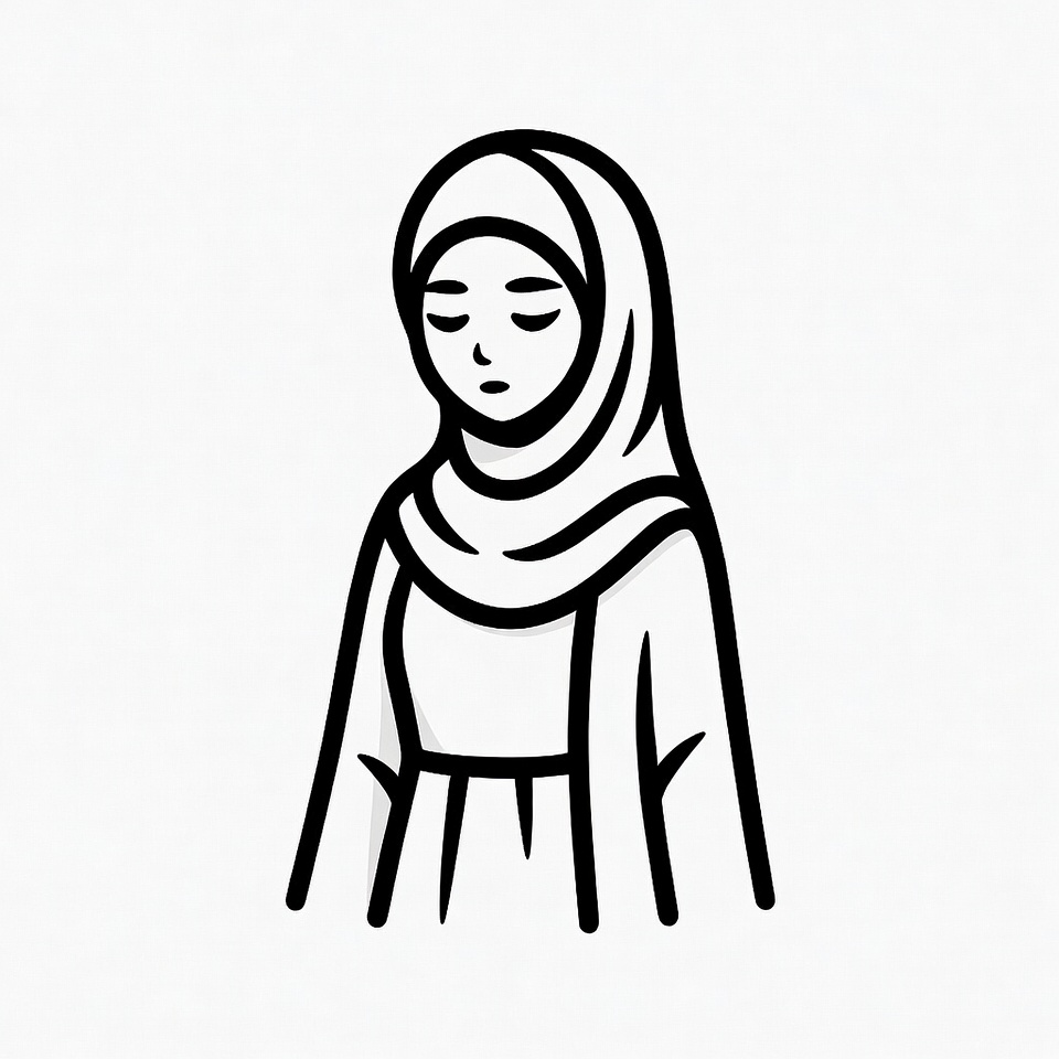 Islamic attire, Middle Eastern, black and white, cartoon woman, clipart, closed eyes, female, headscarf, hijab, illustration, line art, modest clothing, outline drawing, serene expression, simple background, standing, vector art, young woman, Muslim woman