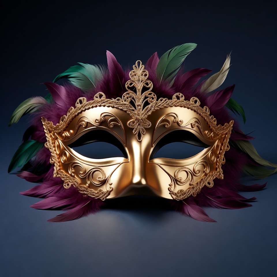 A ornate gold Venetian mask features intricate filigree designs and a dark eye area. It is adorned with vibrant green and purple feathers on a deep blue background. The mask is centered and isolated for a dramatic effect.