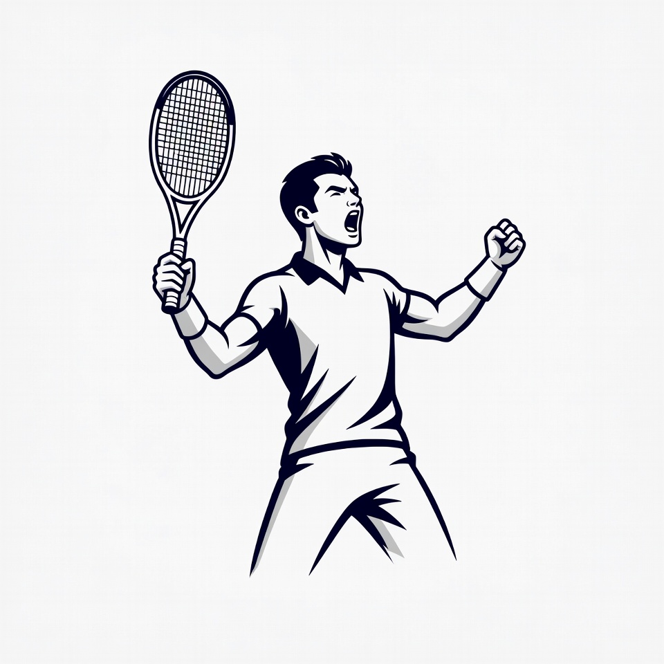 A black and white illustration depicts a muscular man triumphantly celebrating with a tennis racket raised high. He wears a collared shirt and shorts, stands with legs apart, mouth open in a shout, and one fist clenched. The dynamic pose is set against an isolated white background.