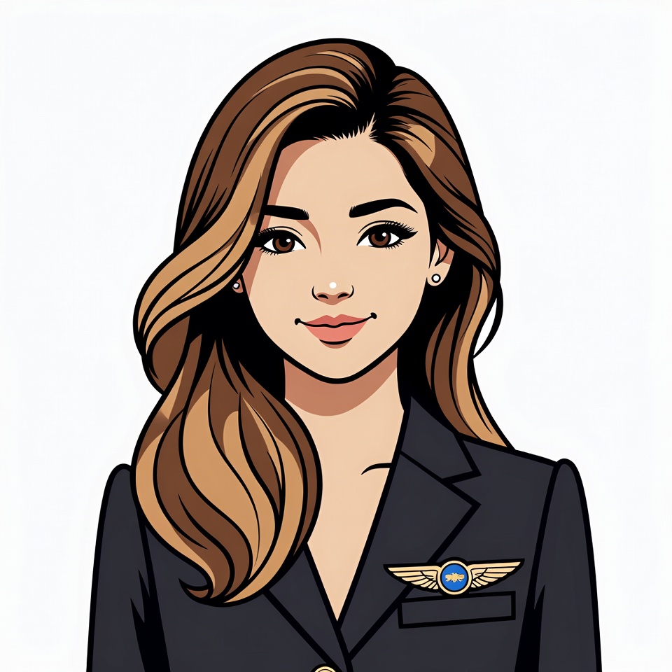 A cartoon illustration of a young Asian woman with long wavy brown hair smiling at the viewer. She wears a black suit jacket with gold buttons and a blue winged pilot badge on the lapel. The image features a clean white background.