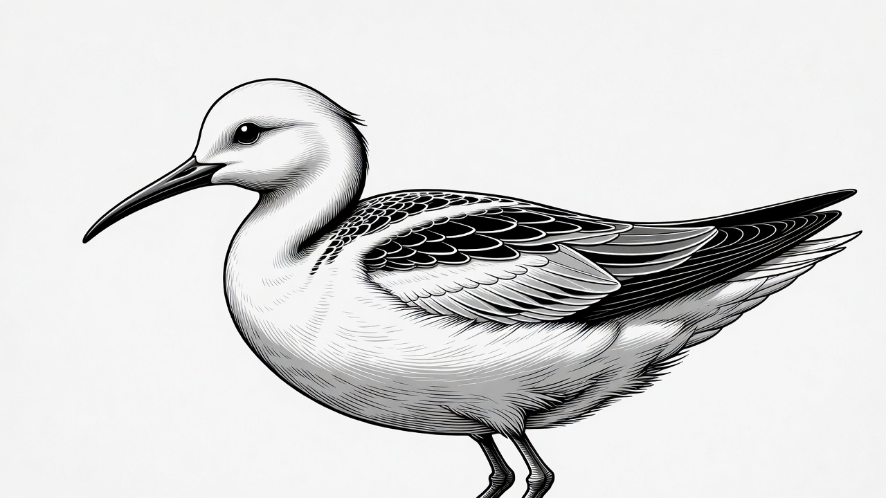 animal, avian, bird, black wings, curved beak, detailed sketch, feathers, illustration, isolated background, line drawing, plover, shorebird, white bird, wildlife, black-bellied plover