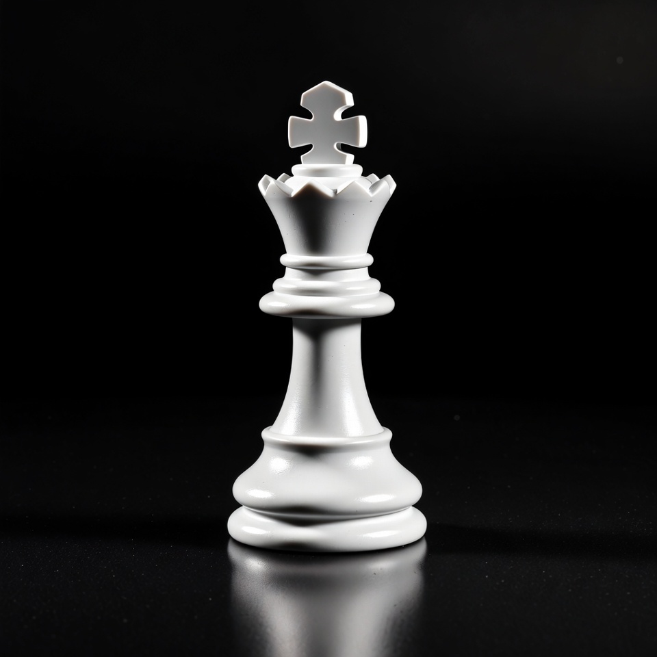 A white king chess piece stands prominently against a solid black background. The piece features a detailed cross on top, ornate crown, and classic base. It is centered and isolated for a clean, striking visual.