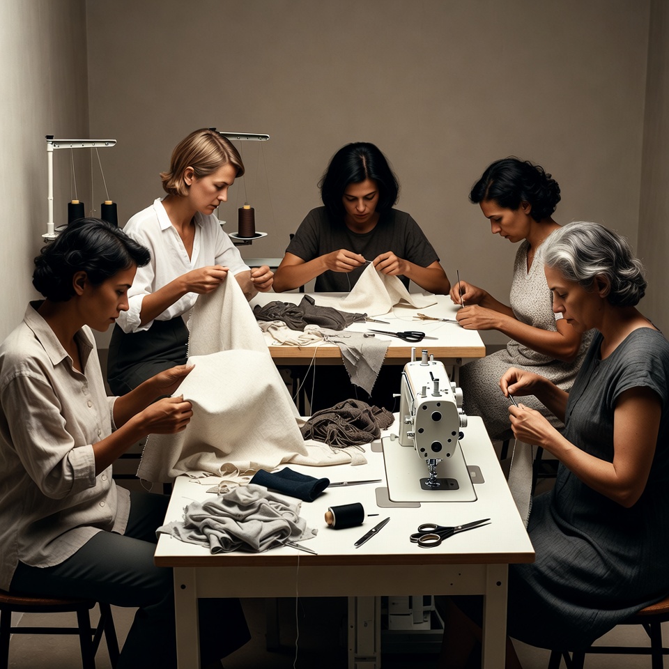 Five women of diverse ages and hair colors sit around two white tables in a beige room, sewing fabric and garments by hand. They use sewing machines, scissors, and threads scattered on the tables. One woman with blonde hair wears a white blouse, while others are dressed in neutral tones like gray and beige.