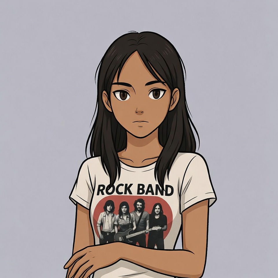 An anime-style illustration of a young Asian woman with long dark hair and a neutral expression stands against a light blue background. She wears a white t-shirt featuring a printed image of a classic rock band with four members, two women and two men, holding guitars. Her arms are crossed in front of her.