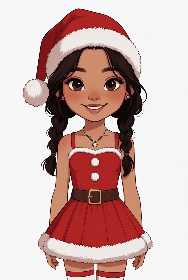 Christmas, Multiracial, Santa hat, black belt, braided hair, buttons, cartoon, cute girl, female, illustration, isolated background, pigtails, red dress, smiling, stockings, white trim, anime girl