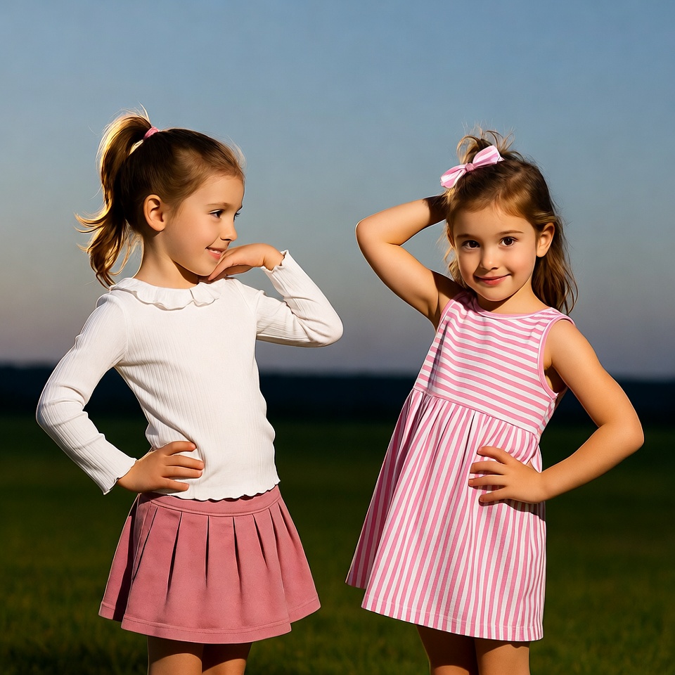 Two young girls with ponytails stand on a grassy field under a blue sky at sunset. The girl on the left wears a white collared long-sleeve top and burgundy pleated skirt, hand on chin. The girl on the right wears a pink striped sundress, hand on head.