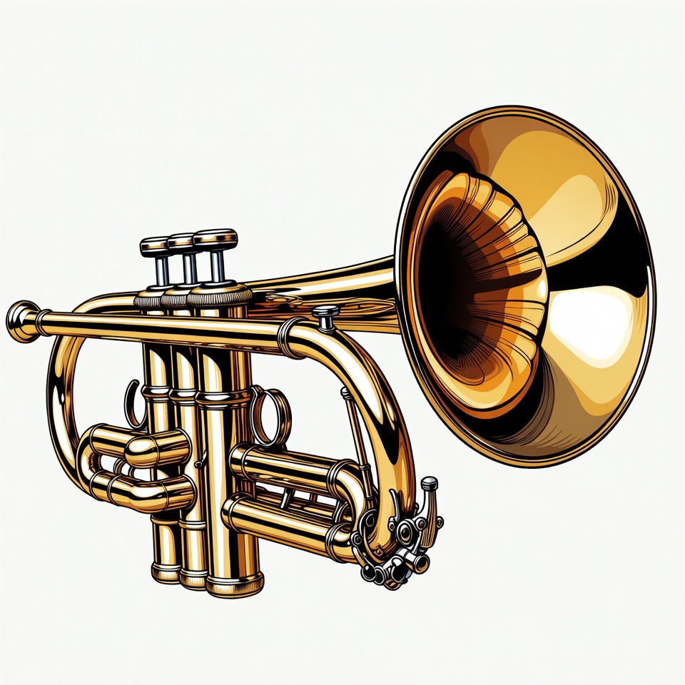 band instrument, brass instrument, brass tubing, clipart, flared bell, golden trumpet, illustration, isolated background, jazz trumpet, musical instrument, orchestral trumpet, shiny brass, trumpet valves, vector art, trumpet