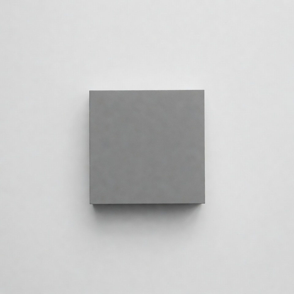 A solid gray square is centered on a plain white background. The square has a subtle three-dimensional appearance with soft shadows. It is isolated against the minimalist backdrop.